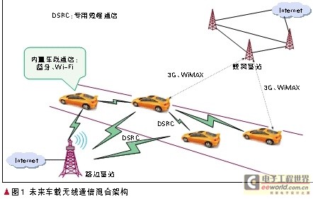 本文認為在不久的將來車載通信將建立于一種混合式的架構,如圖1所示。在這種混合架構中,長距離通信技術,如蜂窩網絡和WiMAX,能夠為人們提供即時的互聯網接入;而短距離通信技術,如DSRC、Wi-Fi(即802.11a/b/g),則能夠為安全系統提供實時響應的保障以及為基于位置的信息服務提供有效支持。