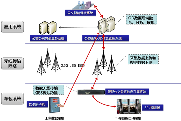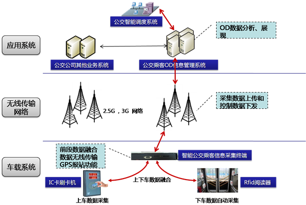 智能公交客流信息管理系統按照數據采集、傳輸和應用實現,主要三大部分構成,分別是前端計數系統、無線傳輸系統和后臺管理系統三部分構成。