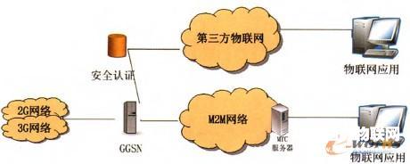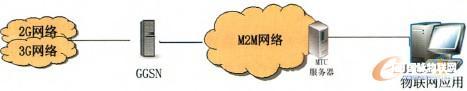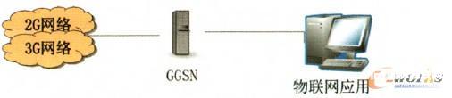 階段:通過現有核心網承載物聯網業務。不用構建物聯網平臺,將物聯網業務直接連接到GGSN,組網簡潔,節約成本。其缺點是可靠性不強,占用現網資源,并且當物聯網發展到一定規模時網絡容量受限制。該階段出現于物網發展的初期階段,此時業務量不足、需求少,如圖1。