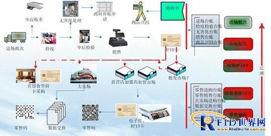 整個項目期間共建立100000頭生豬的基于RFID和條碼技術相結合的質量控制管理屠宰示范基地,包括50個RFID閱讀器、10臺觸控查詢一體機和屠宰質量控制軟件4套。建立了1個示范批發市場和5個農貿市場10家賓館等豬肉質量控制管理銷售流通示范基地;