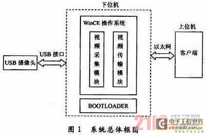 該設計主要由3大部分組成,USB攝像頭通過USB接口與AMR開發板(下位機)相連,PC機(上位機)通過網絡接口(網卡)和以太網線與ARM開發板相連。攝像頭負責對圖像數據的采集,然后將數據傳送到運行在WinCE上的服務端程序,服務端程序負責將采集到的圖像數據進行處理,然后再將其傳送到運行在PC機上客戶端程序并顯示出來。系統總體框圖如圖1所示。
