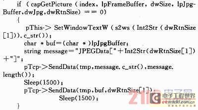 圖像數據是通過攝像頭來采集的,服務端如何調用攝像頭已成為問題的關鍵。硬件與軟件之間的聯系,必須通過驅動程序來實現。攝像頭的驅動已經封裝成動態鏈接庫DLL文件了,而且還提供了所有的功能接口函數。因此,只要直接調用其接口函數就能夠實現相應的功能。具體的步驟是打開攝像頭設備,初始化攝像頭設備,初始化視頻信息,獲取視頻幀與JPEG圖像,關閉視頻設備。其中,獲取視頻幀與JPEG圖像最關鍵,獲取視頻幀與JPEG圖像的主要代碼如下: