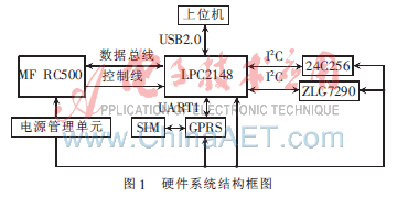 IC卡無線手持機的硬件系統結構框圖如圖1所示。圖中,LPC2148為終端的主控單元,通過GPIO口與IC卡讀卡芯片MF RC500相連實現對IC卡的讀寫;通過串口1(URRT1)與GPRS模塊MC55相連實現GPRS數據傳輸;系統外擴一塊I2C接口的E2PROM芯片24C256,用于存儲終端設置參數以及暫存IC卡用戶在本機的交易信息;通過LPC2148自帶的USB接口實現上位機對讀寫器相關參數的設置以及交易信息的離線上傳。