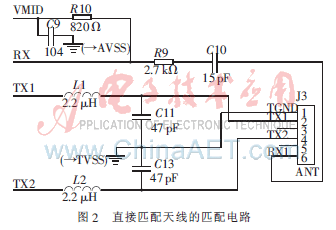 (3)阻抗匹配:在圖2中由電容C11和C13組成,電容的值由天線本身和環境因素來決定,本系統C11、C13均取47 pF。該部分電路主要是為了實現濾波和天線之間的阻抗匹配,以使天線的性能達到最佳。