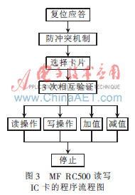 MF RC500實現對IC卡讀寫的程序流程如圖3所示。