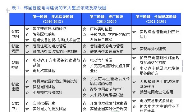 目前韓國政府正在濟州島開展智能電網實證試驗。韓國智能電網協會為韓國的智能電網建設發布了階段性目標:到2012年建造世界最高水平的智能電網示范城市;到2020年建造以消費者為主的廣域單位智能電網,實現CO2減排25%;到2030年之前在全國構建智能電網,帶動5萬人就業并培育74萬億韓元(約合人民幣6,000億元)的內需。韓國智能電網建設的重點領域和路線圖見表1。與此同時,韓國政府還不余遺力在全球進行宣傳和推廣,力爭到2030年能使韓國企業在全球智能電網市場中占據30%的市場份額,創造又一個“漢江奇跡”。
