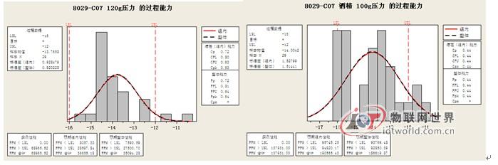 圖3、圖4為未敷膜芯片在不同壓力、不同潔凈度下制作的電子標簽的制程能力分析,因Cpk<0.67,為D級,說明制程能力嚴重不足,不可接受。