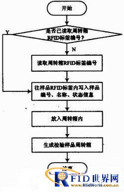 綜合業務部門基于接收的形形色色的食品樣品,將其分類裝進貼有RFID標簽的周轉盒,并同時往RFID標簽內寫入相對應的樣品編號、名稱信息、狀態信息,此即完成樣品的制樣過程。將已制好樣的樣品置入周轉箱內,即完成樣品周轉箱的生成操作,實現了樣品、周轉箱的信息綁定。其具體流程圖如圖1所示。