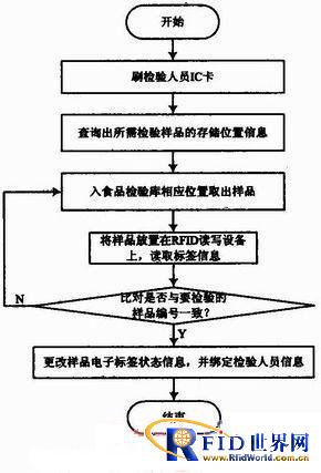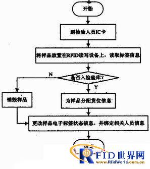 此階段是通過單標簽的讀、寫操作,更改每個RFID電子標簽的狀態信息,以及綁定相應的檢驗樣品成員信息。由于讀寫范圍要求不高,此階段選用高頻RFID讀寫設備。其具體業務流程如圖3所示。