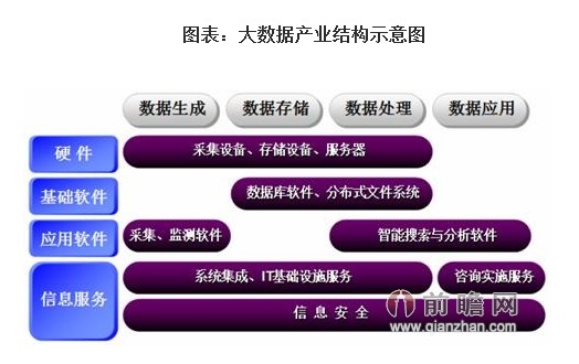 前瞻產業研究院《2014-2018年中國大數據產業發展前景與投資戰略規劃分析報告》顯示,大數據產業主要涉及數據生成、存儲、處理分析、應用四個環節,具體來看,包含硬件設備、處理分析環節、綜合處理、語音識別、視頻識別、商業智能軟件、數據中心建設與維護、IT咨詢、方案實施、信息安全等領域。