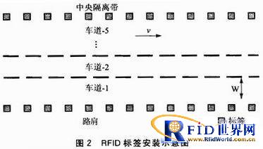 以雙向(xiang)道路(lu)的(de)(de)一(yi)側為例(li),RFID標簽安(an)裝示意圖(tu)如圖(tu)2所示。車(che)(che)輛(liang)自(zi)左(zuo)向(xiang)右行駛,標簽以一(yi)定(ding)間距安(an)裝于(yu)路(lu)肩和中央隔離(li)帶。從靠近路(lu)肩的(de)(de)一(yi)側定(ding)義(yi)車(che)(che)道依(yi)次為1~5車(che)(che)道。設車(che)(che)道寬度為W,令lO為全向(xiang)天(tian)(tian)(tian)線(xian)的(de)(de)閱讀(du)距離(li),lD1為車(che)(che)輛(liang)右側定(ding)向(xiang)天(tian)(tian)(tian)線(xian)的(de)(de)閱讀(du)距離(li),lD2為車(che)(che)輛(liang)左(zuo)側定(ding)向(xiang)天(tian)(tian)(tian)線(xian)的(de)(de)閱讀(du)距離(li)。其(qi)中lD1=lD2=W,lO=2W。