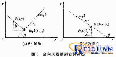 定位(wei)到車(che)道之后,可以(yi)根據下述方法(fa)計算出車(che)輛的(de)位(wei)置坐標。全向天線讀到右側標簽、讀到左側標簽如(ru)圖(tu)3和圖(tu)4所示(shi)。