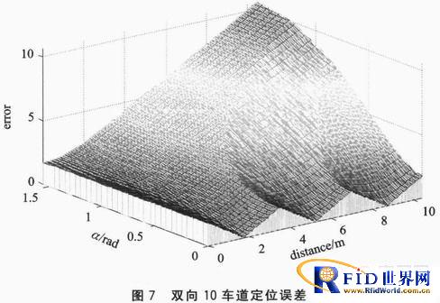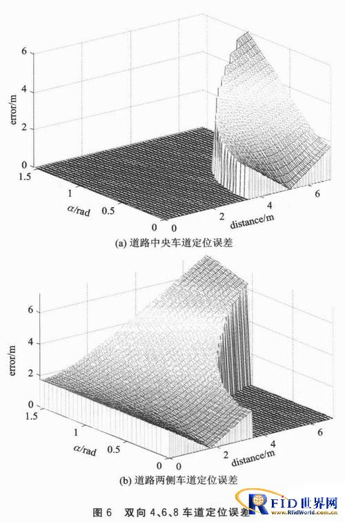 車(che)(che)(che)(che)載RFID主動定位(wei)方(fang)法中車(che)(che)(che)(che)輛(liang)在道(dao)(dao)(dao)(dao)路的(de)(de)不同(tong)位(wei)置的(de)(de)定位(wei)誤差(cha)(cha)情(qing)況如(ru)圖6、圖7所示(shi)。圖6(a)為雙向(xiang)(xiang)6車(che)(che)(che)(che)道(dao)(dao)(dao)(dao)道(dao)(dao)(dao)(dao)路的(de)(de)第(di)(di)2車(che)(che)(che)(che)道(dao)(dao)(dao)(dao)和(he)雙向(xiang)(xiang)8車(che)(che)(che)(che)道(dao)(dao)(dao)(dao)道(dao)(dao)(dao)(dao)路的(de)(de)第(di)(di)2、3車(che)(che)(che)(che)道(dao)(dao)(dao)(dao)的(de)(de)定位(wei)誤差(cha)(cha),(b)為雙向(xiang)(xiang)4、6、8、車(che)(che)(che)(che)道(dao)(dao)(dao)(dao)道(dao)(dao)(dao)(dao)路的(de)(de)其余車(che)(che)(che)(che)道(dao)(dao)(dao)(dao)的(de)(de)定位(wei)誤差(cha)(cha)。圖7為雙向(xiang)(xiang)10車(che)(che)(che)(che)道(dao)(dao)(dao)(dao)道(dao)(dao)(dao)(dao)路各車(che)(che)(che)(che)道(dao)(dao)(dao)(dao)的(de)(de)定位(wei)誤差(cha)(cha),第(di)(di)1車(che)(che)(che)(che)道(dao)(dao)(dao)(dao)和(he)第(di)(di)5車(che)(che)(che)(che)道(dao)(dao)(dao)(dao)及(ji)第(di)(di)2車(che)(che)(che)(che)道(dao)(dao)(dao)(dao)和(he)第(di)(di)4車(che)(che)(che)(che)道(dao)(dao)(dao)(dao)的(de)(de)定位(wei)誤差(cha)(cha)相(xiang)同(tong)。