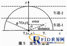 以(yi)雙向4車(che)(che)道(dao)道(dao)路的(de)第一(yi)車(che)(che)道(dao)為(wei)例。圖5表示車(che)(che)輛(liang)位于(yu)第一(yi)車(che)(che)道(dao)時(shi)與(yu)標(biao)簽T1的(de)位置關系,R為(wei)閱讀器全向天線的(de)閱讀半(ban)徑,V(x,y)為(wei)車(che)(che)輛(liang)定位坐標(biao),distance為(wei)車(che)(che)輛(liang)與(yu)標(biao)簽的(de)距離(li),α為(wei)車(che)(che)輛(liang)相對于(yu)標(biao)簽的(de)位置角度,error為(wei)定位誤(wu)差。