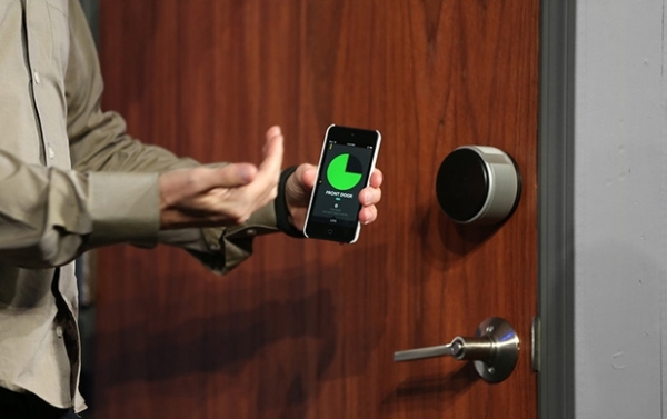 August 智能鎖配合 iPhone 使用。當屋主靠近房門時,August 通過藍牙識別手機,然后自動開鎖。屋主進入房間后,August 會自動鎖門。August 的應用還能提供一系列控制手段,比如向家人或好友分享數字密鑰。另外,應用還能記錄哪些人進入過房間,以及進入房間的具體時間。