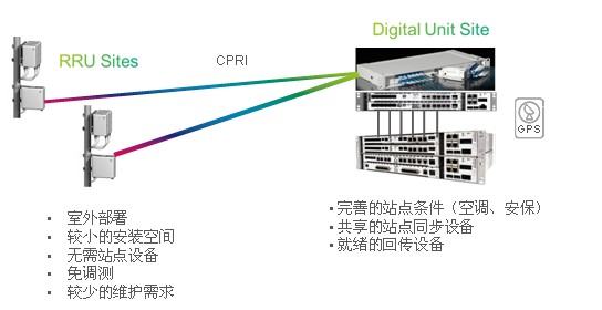 目前無線基站通常采用main-remote結構,也就是把傳統基站的基帶處理部分(BBU)和射頻部分(RRU)分開的基站設備形態,BBU與RRU之間采用高速CPRI光接口連接,BBU和RRU即可共站放置,也可分站放置。運營商可將多個BBU集中放置在已有的宏站,而只在新站布放RRU。由于RRU遠端模塊靈巧輕便、便于安裝維護,對機房條件和配套要求較低,系統CAPEX和OPEX低,因此可以大范圍高密度地使用,從而達到建設高容量廣覆蓋的無線網絡目的。