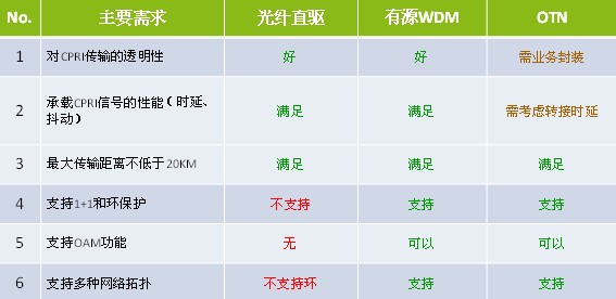 下面對幾種目前可選的CPRI傳輸方式進行比較分析比較: