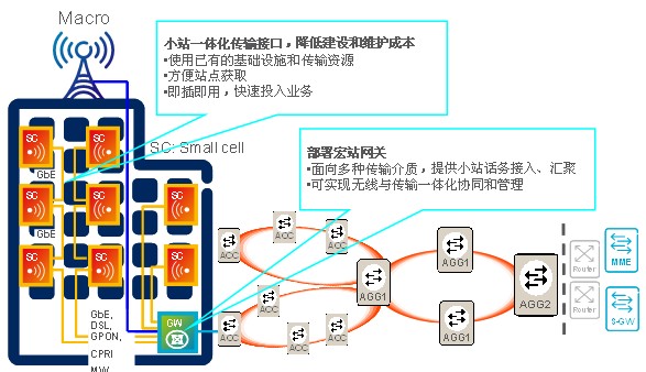 小基站回傳最后一公里可分為有線和無線兩種場景:無線場景可用于在沒有線纜資源或難以鋪設線纜的室外小蜂窩的回傳,根據站點情況采用視距(LOS)或非視距(NLOS)微波設備;有線場景則可采用宏站內置的具有多種媒介接入能力的接入網關設備(RadioAccess Gateway)或板卡,采用多種傳輸介質和技術(如VDSL,FTTx),將小基站話務先匯聚到宏基站,再由已部署到宏基站的回傳網絡實現向核心網的傳輸(如下圖所示)。該方案可充分保證保證小基站傳輸接口與宏站網關的互通性和可管理性,達到宏站和小基站的統一協調和管理,具有維護界面清晰和對已有基于宏站的回傳網絡架構無任何沖擊的優勢。