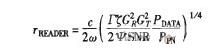 超高頻RFID讀寫器接收機工作時也需要發射機發出無調制的載波.接收機接收到的包括標簽反射信號、天線噪聲、環境反射、發射機直接耦合,以及接收機自身的噪聲等。在標簽能獲得足夠工作能量的前提下,讀寫器的工作距離主要取決于標簽反向散射信號在讀寫器的解調輸出能否滿足最低信噪比要求.根據文獻[3],可用下面的公式來標示讀寫器決定的最大工作距離: