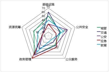 同方將現在各政府部門的業務數據,通過基礎設施、公共安全、公眾服務、政務管理和資源統籌與經濟監測五大領域體征綜合展現出來,就如圖3的雷達圖一樣,很清晰地展示出這個城市在哪些領域存在短板,哪些領域處于優勢。