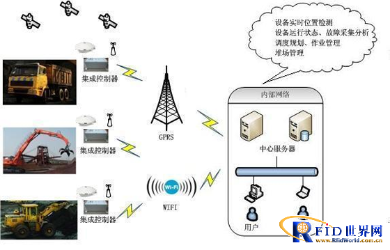 將集成控制器安裝在機械設備的司機室,采集設備的位置信息與運行狀態等數據。通過GPRS或WIFI網絡將數據傳送至管理服務平臺,平臺上運行定位和堆場管理服務軟件,提供圖形化顯示、調度規劃與堆場管理功能,通過B/S或C/S的客戶端給各用戶提供服務。