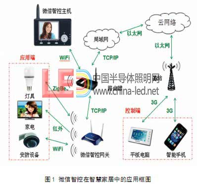 微信智控在智慧家居中的基本應用如圖1所示,當用戶在控制端通過手機或電腦上的微信向應用端發送文字、語音與圖片等信息時,這一信息很快會通過3G網絡傳輸到應用端附近的路由器。通過網線TCP/IP協議,路由器再將信息傳輸給微信智控網關(一種專門用于微信智控通信的網關),該網關一邊進行數據存儲,一邊進行協議轉換,并很快將信息轉換成新的指令[3]。新指令在智慧照明、智慧家電與智慧安防應用中有不同的表現形式與傳輸方式,下面分別來論述它們。