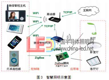 當你身在千里之外使用手機上微信,并想控制家里的燈具照明時,你只需輕敲鍵盤輸入文字,或直接說話錄音,即可將指令經過互聯網發送到你家的路由器上。路由器再將指令通過網線傳輸給微信智控網關。如圖3所示,微信智控網關則將指令按ZigBee協議打包并通過ZigBee天線向外輻射出去。應用端ZigBee無線收發模塊[5]內置于燈具內,相鄰的兩個燈具之間可以相互通訊。眾多的燈具便可以組成一個照明網絡,網絡將按需路由算法AODV找到最優傳輸路線,并最終將指令發送到目標燈具,目標燈具則會立馬按照指令做出相應的反應,如開、關、調光、定時,或回傳當前工作狀態。