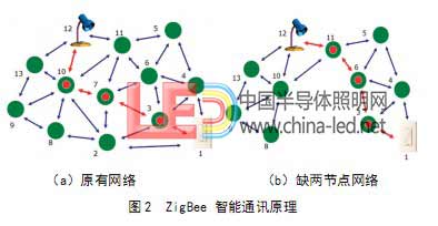 每個家庭都需要用燈具來照明,而控制燈具的方法現階段國內仍以普通開關為主,少數采用紅外遙控、315MHz與433MHz射頻遙控等方式。微信智控系統中采用2.4GHz的ZigBee協議[4],而ZigBee采用了按需路由AODV算法,可以輕松地實現燈具之間的智能組網、智能擇路,遠距離無線傳遞信息。如圖2(a)所示,當ZigBee遙控開關(1號節點)對節點12的臺燈發出指令時,根據AODV算法,指令將被傳輸到節點3,然后是節點7、節點10、最后到達臺燈,臺燈根據指令做出相應的動作,如開、關、調光、定時等。當網絡上2號節點與7號節點被移除時,如圖2(b)所示,1號節點開關發出的指令時,會重新計算路線,新路線將途經節點3、節點6、節點11,最后到達節點12臺燈。由此可見,只要每兩個節點之間能保持通訊,則節點的增減不會對通訊造成影響。