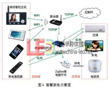 如圖4所示,智慧家電中也有四種控制終端,與智慧照明差不多。微信智控主機、電腦與手機控制時走的是無線網路,途經路由器與微信智控網關,最終由微信智控網關紅外遙控家電完成相應的動作,只是省去了局域網與云網絡通信部分,具體原理見上文。
