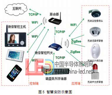 同樣的,安防設備也可以在家里操控,常用的控制端主要有微信智控主機、電腦與手機。它們均采用WiFi協議與路由器通訊,路由器、微信智控網關與磁盤陣列存儲器之間用網線相連,見圖5。監控錄像每時每刻都在拍攝,并將數據采用WiFi傳輸給微信智控網關,后者將錄像存儲在磁盤陣列存儲器中,控制端如有需要,則讀取最后一段視頻或圖片傳輸過去。
