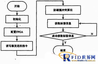 工作原理:啟動時,通過PC配置射頻參數,射頻參數存入緩沖區寄存器中,初始化內存;應用程序發出對標簽的應用功能指令,該指令通過應用程序接口調用標簽識別處理模塊,標簽識別處理模塊發出相應的指令給基帶處理模塊,基帶處理模塊對指令進行編碼調制形成基帶信號,通過PCIe接口將基帶信號發送給射頻板;主控部分通過PCIe接口接收射頻板傳送來的基帶信號,基帶處理模塊對基帶信號進行解調,形成標簽反向散射的指令格式,傳至標簽識別處理模塊,標簽識別處理模塊對指令進行相關CRC校驗對做出相應的響應。軟件流程如圖3所示。