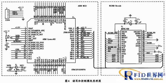 系統的關鍵部件是讀寫器,它由微處理器、外圍擴展器件、讀寫芯片、射頻天線、串行通信接口等幾部分組成。接上串行口和+5 V電源之后不僅可以讀卡而且可以與計算機進行通信。讀寫器是由STM32F103RBT6型ARM控制專用讀寫芯片(MF RC500)組成,其系統原理圖如圖4所示。