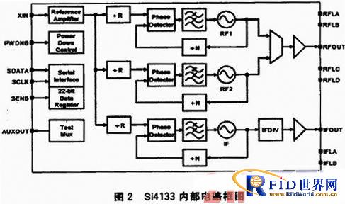 Si4133是Silicon Laboratories公司推出的一款應用于GSM和GPRS無線通信的芯片,內部含有集成壓控振蕩器的多邊帶射頻頻率合成器。其內部框圖如圖2所示。