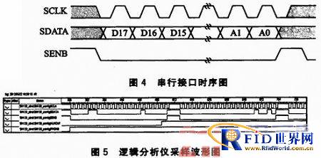 為利用FPGA內部的嵌入式邏輯分析儀對實際的信息進行采樣得到的部分波形圖,如圖5所示。可以看到,對Si4133進行配置的波形符合時序圖,完成了對Si4133的配置,達到了預期的效果。