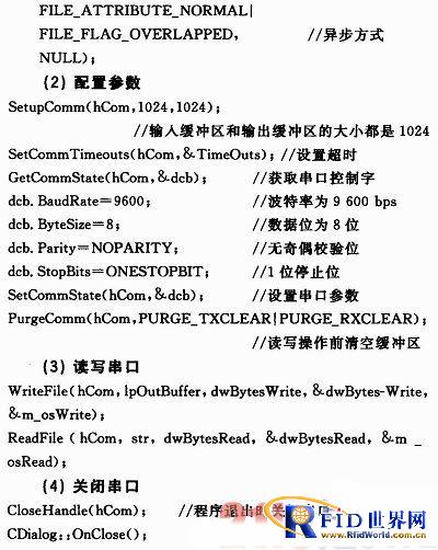 上位機軟件采用Microsoft公司的VC++6.0編寫,使用API函數方式編程。串口上位機編程分4個步驟:打開串口、配置參數、讀寫數據、關閉串口。下面詳細介紹各個步驟用到的一些函數。