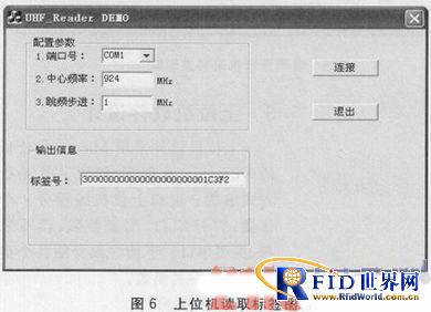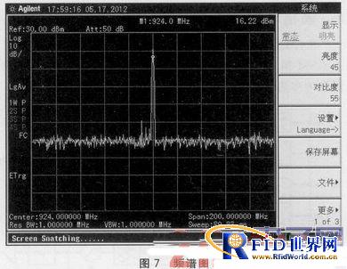 圖7為用安捷倫的頻譜儀實際測試的頻譜圖。可以看到,中心頻率與軟件設置的924 MHz一致,輸出功率為16.22 dBm。由測試結果可以看出,功率輸出、相位噪聲、雜散抑制等都達到較好的效果,應用于UHF讀寫器項目中,能夠順利工作。通過上位機設置中心頻率為924MHz,跳頻步進為1 MHz。讀取到的標簽號為300000000000000000000001C3F2,為十六進制顯示,與圖6中輸出信息中的標簽號相同。