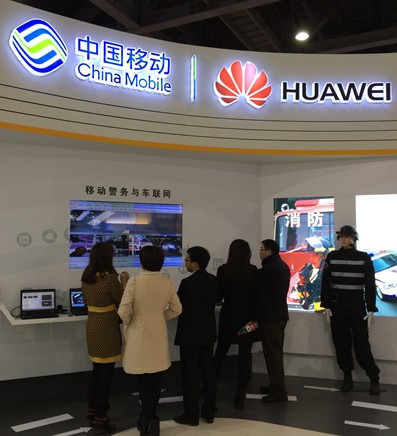 圖片說明:華為在2013年中國移動全球合作伙伴大會上展示移動警務與車聯網等4G行業應用