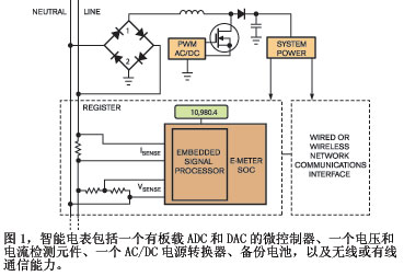 智能電表由一個帶有板載ADC和DAC的微控制器、一個電壓和電流檢測元件、一個AC/DC電源轉換器、備份電池以及無線或有線通信功能組成(圖1)。