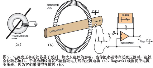 最常用的隔離傳感器依次是:電流變壓器、Rogowski線圈和霍爾效應傳感器(圖2)。電流變壓器有一個鐵芯,很容易受到強大永久磁場的影響。靠近變壓器的磁鐵會使磁芯飽和,使檢測線圈無法拾取交流線上的AC電場。Rogowski線圈為空氣磁芯,包括一卷圍繞著電力線的導線。與鐵芯不同,空氣磁芯在強永久磁場情況下不會飽和。但是,它易于受其它篡改方法的作用,如存在一個大電感場時,它會耦合到線圈上,壓制住線圈要檢測的AC電流。
