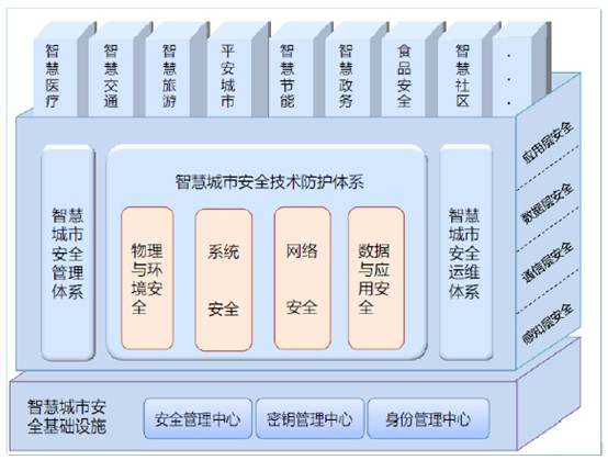 從智慧城市的體系架構來看,智慧城市的安全體系應包括智慧城市安全基礎設施、智慧城市安全管理體系、智慧城市安全運維體系、智慧城市安全技術防護體系。智慧城市安全基礎設施包括容災回復中心、監控應急中心、密鑰管理中心、安全管理中心、安全評測中心和身份管理中心。智慧城市安全管理體系包括安全組織、職責、分工、考評,安全制度、流程、規范,安全意識教育、培訓等。智慧城市安全運維體系包括支撐平臺,服務流程、服務水平,監測、響應、恢復等。智慧城市安全技術防護體系包括數據與應用安全、網絡安全、系統安全和物理與環境安全等。
