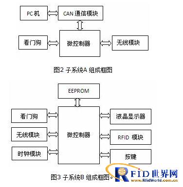 本系統(CAN 節點)有兩個子系統組成。B 子系統由單片機、RFID 模塊、無線模塊、看門狗、液晶屏、時鐘模塊、按鍵和EEPROM 組成。微控制器(MCU)控制RFID 模塊對Mifare 1 卡進行讀寫操作,無線模塊將有關的數據發送給A 子系統。A 子系統由單片機、無線模塊、看門狗和CAN 模塊組成。MCU 將經由無線模塊接收到的數據通過CAN 模塊發送至PC 端。由于一個節點最多可以控制6 個RFID 設備終端,因此在一個完整的系統里,A 子系統只有1 個,而B 子系統最多可以有6 個。