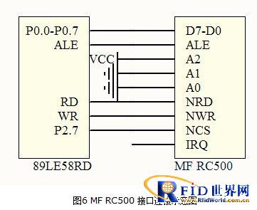 由圖6 所示, MCU 將MF RC500 中的寄存器作為外部RAM進行訪問。INT 管腳懸空,不使用中斷功能。