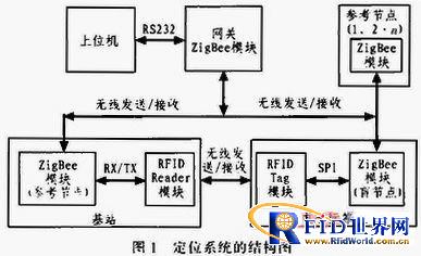 本系統的設計有5個部分組成,包括上位機、網關、基站、電子標簽、參考節點。上位機的功能是監控和管理整個系統。定位系統的結構框圖如圖1所示。