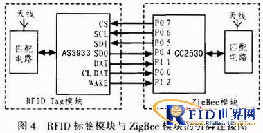 電子標簽的設計包括RFID Tag模塊和zigBee模塊。其中RFID Tag模塊主要是由AS3933前端模擬芯片和匹配電路組成,ZigBee模塊是由射頻芯片CC2530和匹配電路組成。它們之間通過SPI接口進行數據傳輸。CC2530通過SPI接口配置AS3933,詳細的引腳連接如圖4所示。