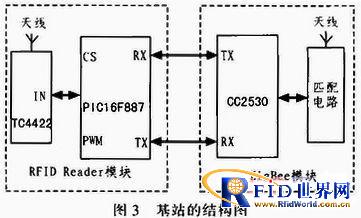 基站的設計包括2個部分,RFID Reader模塊和ZigBee模塊。其中RFID Reader模塊主要是由PIC16F887的微控制器和匹配電路組成。RFID Reader模塊和ZigBee模塊兩者之間通過RX/TX進行數據傳輸。基站的結構框圖如圖3所示。