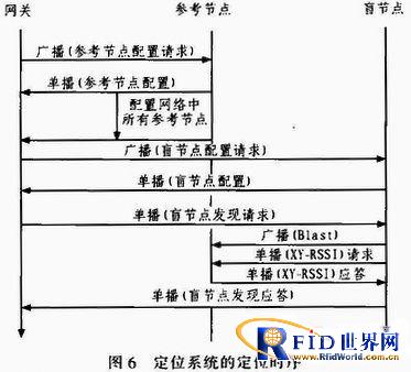 定位系統的基本思想就是系統對網絡內的參考節點和盲節點節點進行參數配置之后,盲節點等待網關發送定位請求,當盲節點接收到網關發送來的定位請求后,就開始發送一系列的RSSI Blast信息進行廣播,參考節點接收到盲節點發送過來的RSSI Blast數據,并保存其RSSI值。等待盲節點已配置完成規定的時間間隔后,盲節點向參考節點發送XY—RSSI請求廣播,每個接收到RSSI Blast信息廣播的參考節點將計算接收到的RSSI值,并根據該請求的RSSI值和之前的RSSI Blast的RSSI值計算出平均值,發送XY—RSSI響應給盲節點,盲節點接收XY—RSSI響應后,參考節點將向盲節點發送自己的坐標信息和RSSI值。盲節點收到這些參數后,根據定位算法計算出自己的坐標信息,最后將計算得到的坐標信息發送給網關,網關再通過串口將數據發送到PC機上。定位系統的定位時序如圖6所示。