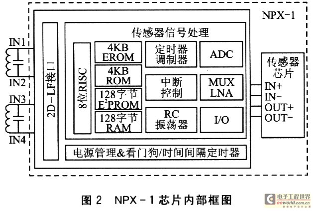在傳感器模塊中,使用NPX芯片作為壓力、溫度傳感器。NPX-l是GE Nova Sensor公司2004年初推出的第二代TPMS(汽車輪胎壓力監視系統)壓力傳感器。其內集成有8位RISC微處理器(采用Philips公司的CPUPCH7970)、壓力傳感器、溫度傳感器、電壓傳感器、低噪聲放大器和12位A/D轉換器;內置RC振蕩器提供系統時鐘,無需外接晶體振蕩器。其硅壓阻式壓力傳感器是采用高精密半導體電阻應變片組成惠斯頓電橋作為力電變換測量電路的,具有較高的測量精度,較低的功耗。NPX-1芯片內部框圖如圖2所示。