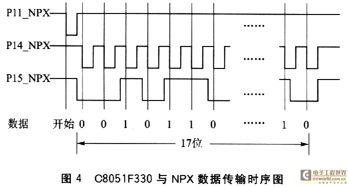 NPX每2s采集1次數據發送給主控制模塊,溫度、壓強各8位,加上l位NPX狀態標志位,一共需要傳輸17位數據。整個通信過程的時序如圖4所示。