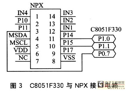 C8051F330和NPX通用L/O的工作電壓都是3.3V,因此可直接利用I/0進行數據傳輸。設計利用3對I/0口完成C8051F330與NPX的通信,其接口電路如圖3所示。