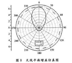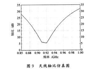 天線具有較好的方向性,最大工作增益可以達到6.15 dB,如圖7和圖8所示。圖9所示的軸比參數仿真圖表明該天線基本滿足了圓極化的要求。